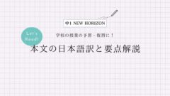 東京書籍 中学1年生 NEW HORIZON(ニューホライズン) Unit9 Part3の本文の日本語訳と重要箇所の解説です。